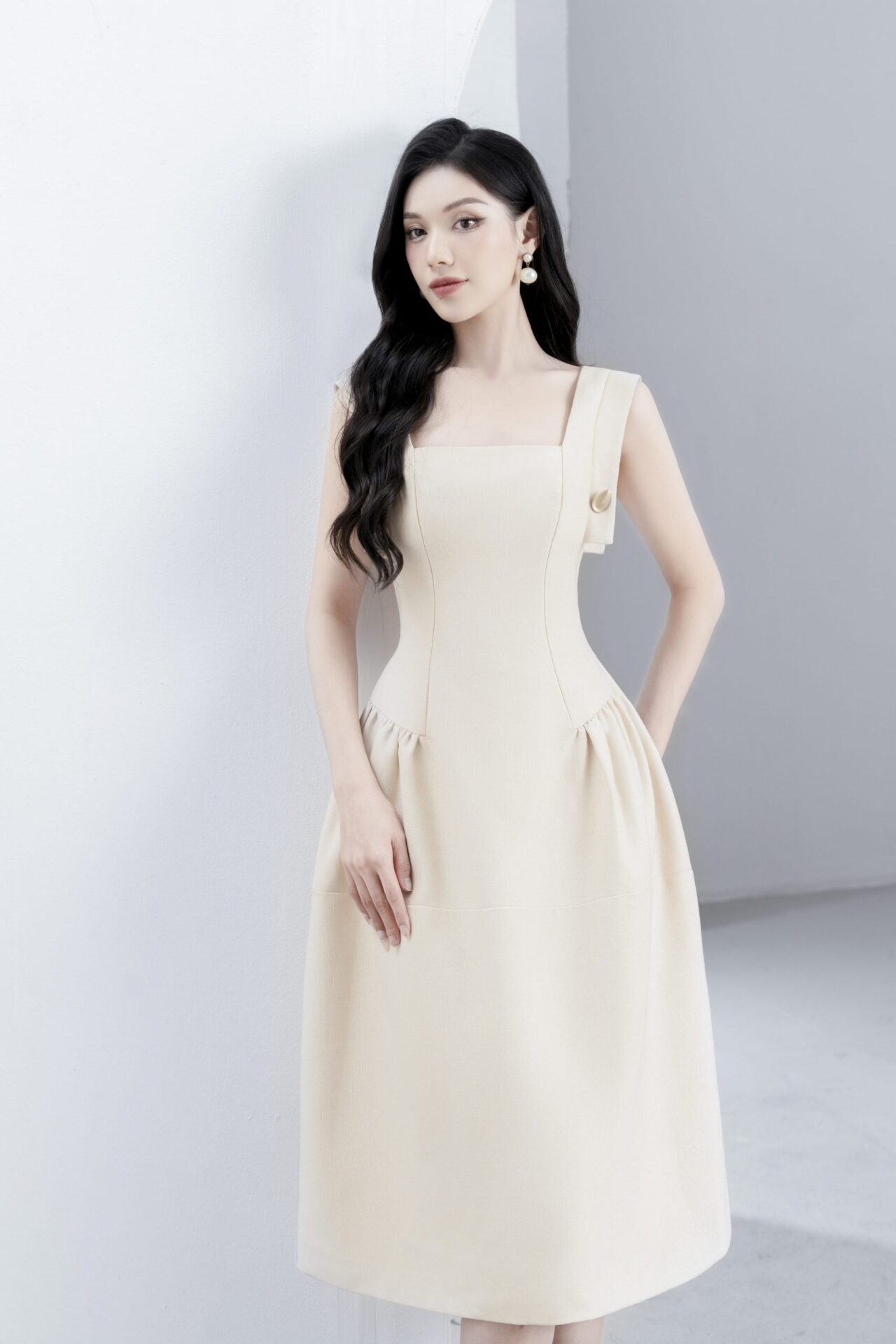 Odessa midi dress with twisted bow sleeves