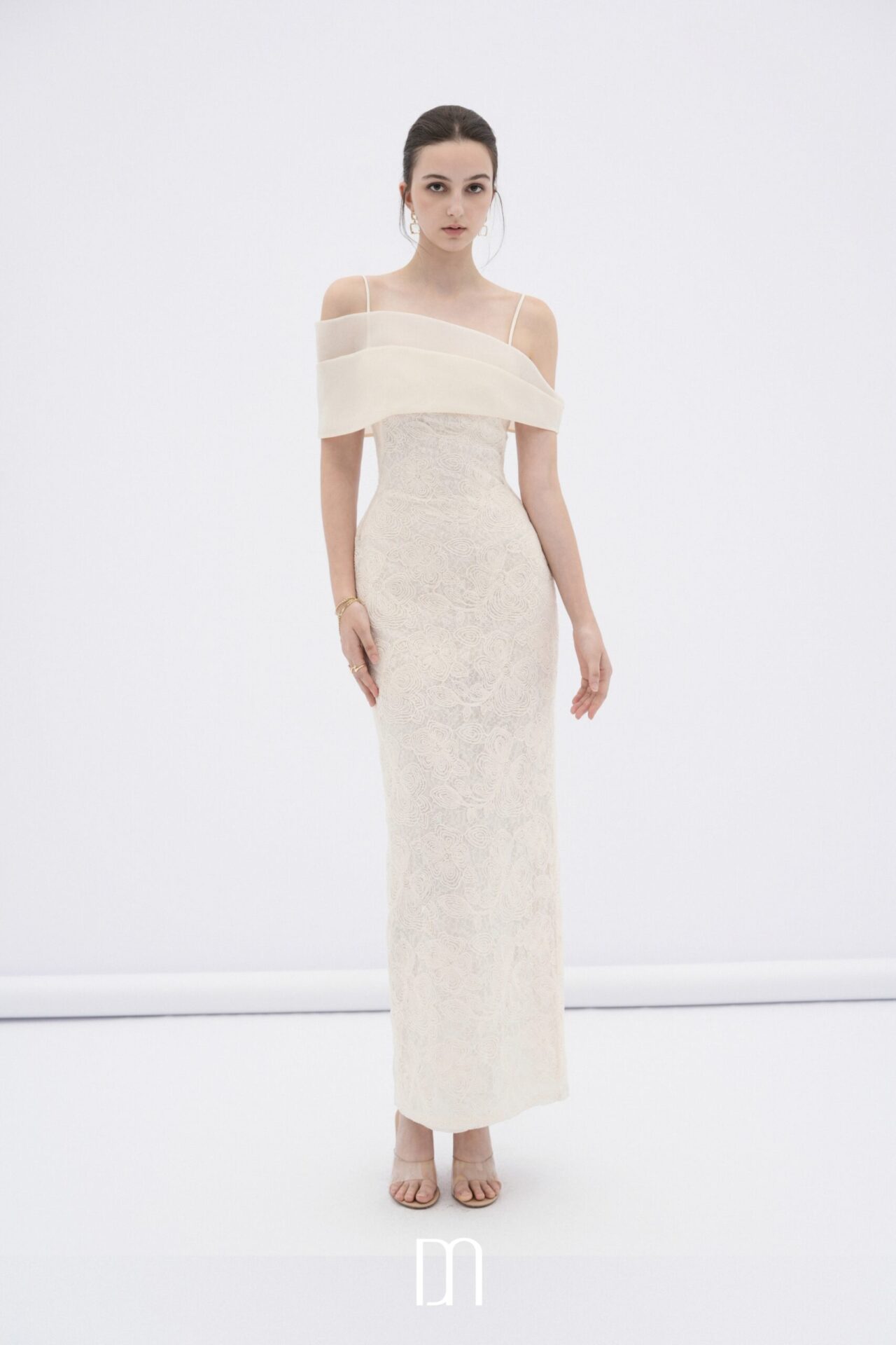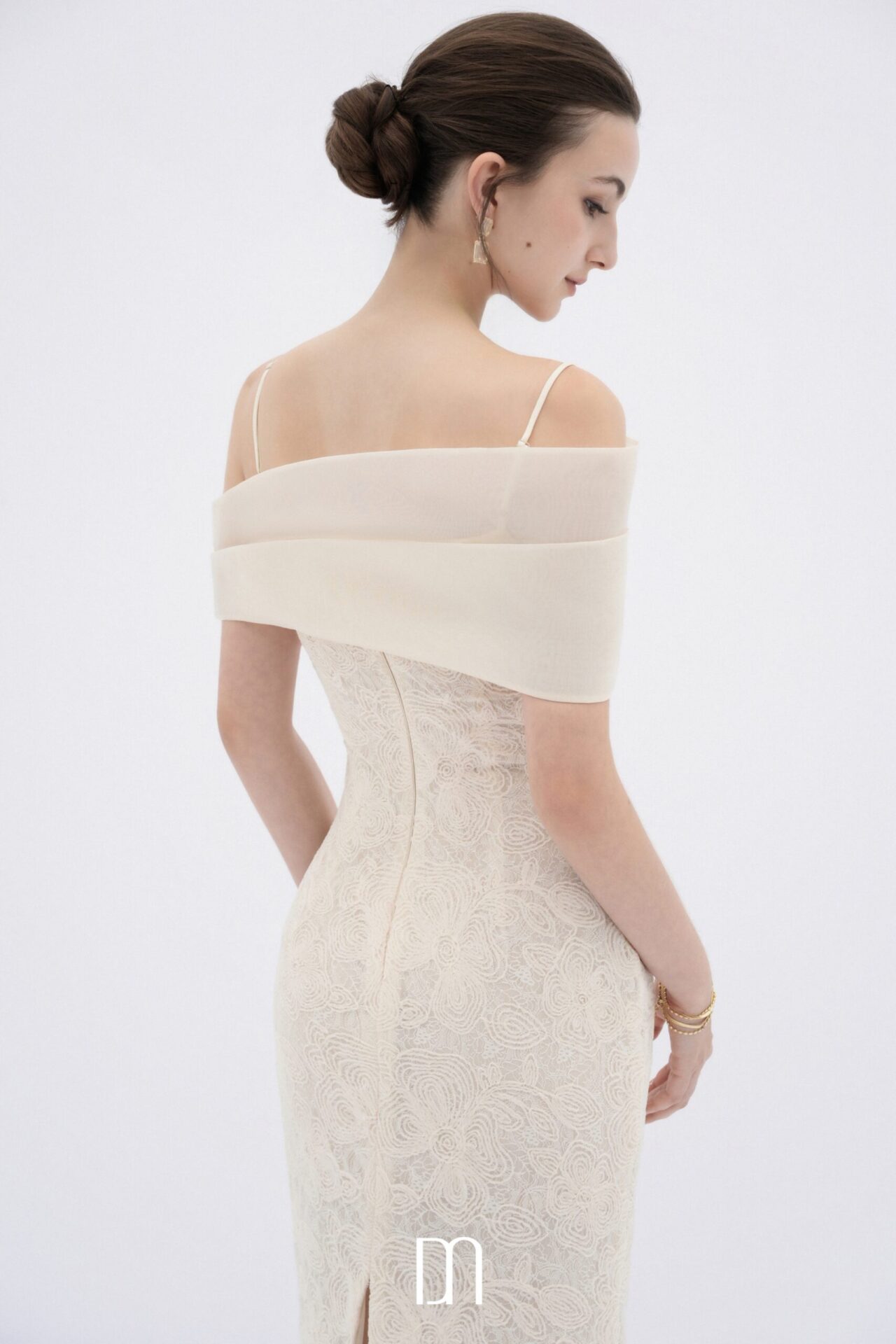 Eira lace body midi dress with sheer off-shoulder panel số lượng